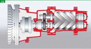 外部齒輪是常用的使反向轉動的轉子同步裝置。由于轉子之間不可能接觸到對方,也不可能接觸到殼體,所以壓縮室內不要求潤滑。因此,壓縮空氣無油。轉子與殼體都要進行的制造,以使從壓縮處向進氣道的泄漏實現小。內置壓縮比受限于進氣道與排氣道的壓力差。這就是為什么無油螺桿空壓機普遍都分級壓縮且內置冷卻、能達到較高壓力的原因。